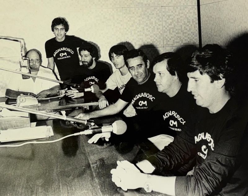 Equipe de Esportes da Rádio Caxias em 1984: Dante Andreis, José Aldo Pinheiro, Otaviano Fonseca, Sérgio Stock, Adelar Neves , Jorge Rodrigues e Gilberto Mendes