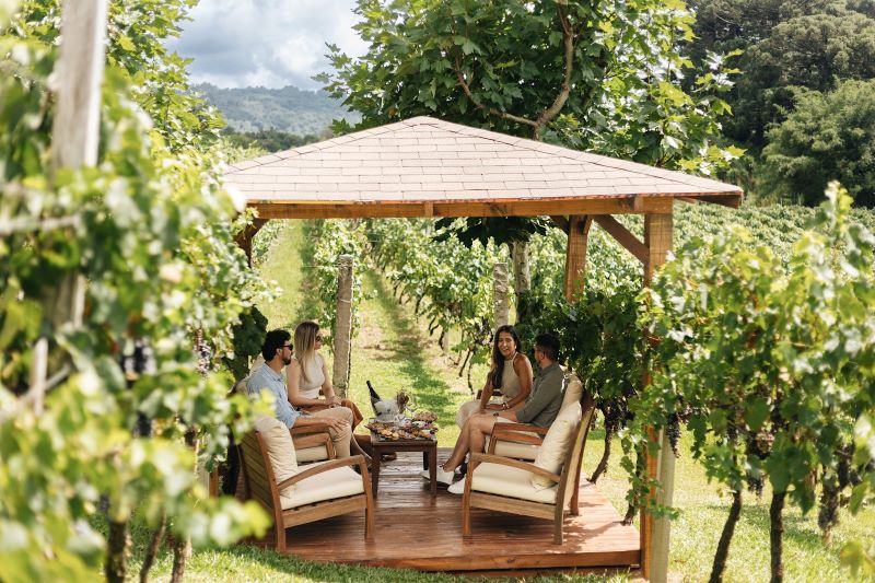 Trata-se de uma evolução natural no conceito, pois antes as experiências eram vividas em bancos e mesas de pallets, e agora ganham um ambiente mais estruturado, moderno e acolhedor, sem perder o charme do contato direto com os parreirais. Privativos e confortáveis, os bangalôs foram criados para receber casais, famílias e grupos que desejam desfrutar do vinho ao ar livre com mais comodidade, criando momentos únicos em meio aos vinhedos.